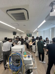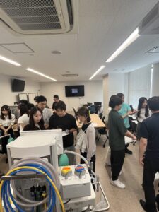 当日は、たくさんの方にご参加いただき、グループごとに呼吸器を操作しながら、基本的な換気モードや波形を学びました。